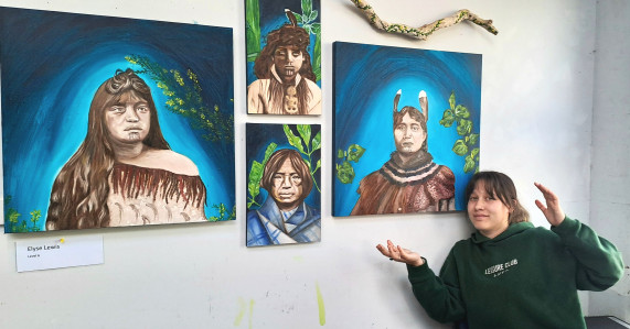 Caption: Level 6 art student Elyse Lewis with her artworks.
