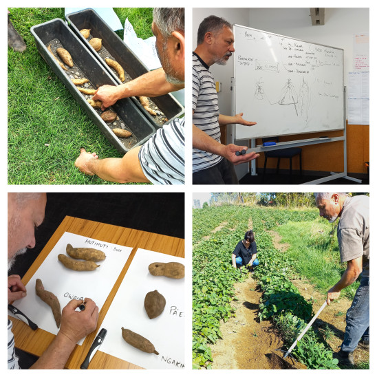 Caption: Glen Skipper (second from left) with WITT students working on kumara crops at a local marae, and (below) Glen with some of the many kumara varieties he has been experimenting with for local soil and climate conditions.