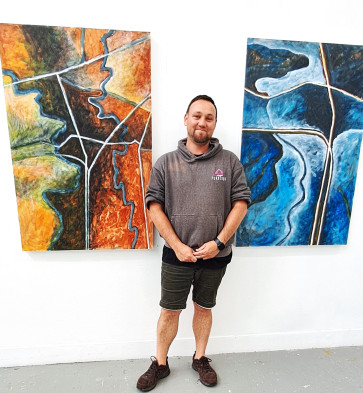Vallance Wrathall (pictured) - Te Ātiawa, Ngā Ruahine, Ngāti Ruanui and Ngāi Tahu – is showing large paintings based on the whenua of Puketapu hapu, in and around Bell Block.