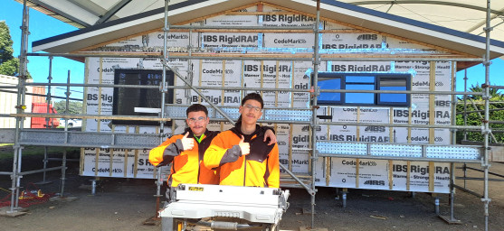 Caption: Chad Jones and Cruz French - trainee carpenters at the Tokaora site.