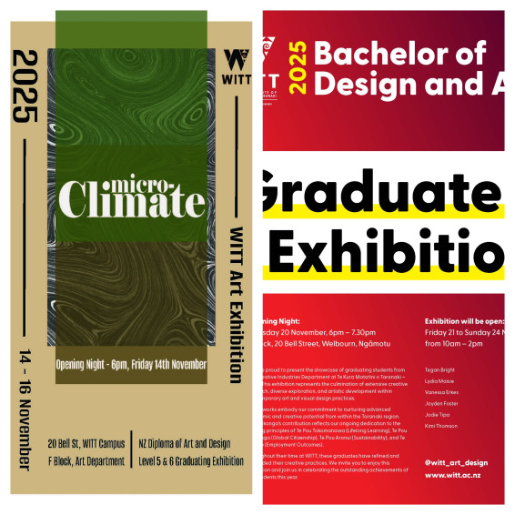 Both exhibitions are open to the public, free entry and can be found at WITT Art Department (F block), 20 Bell Street, Welbourn, Ngāmotu.